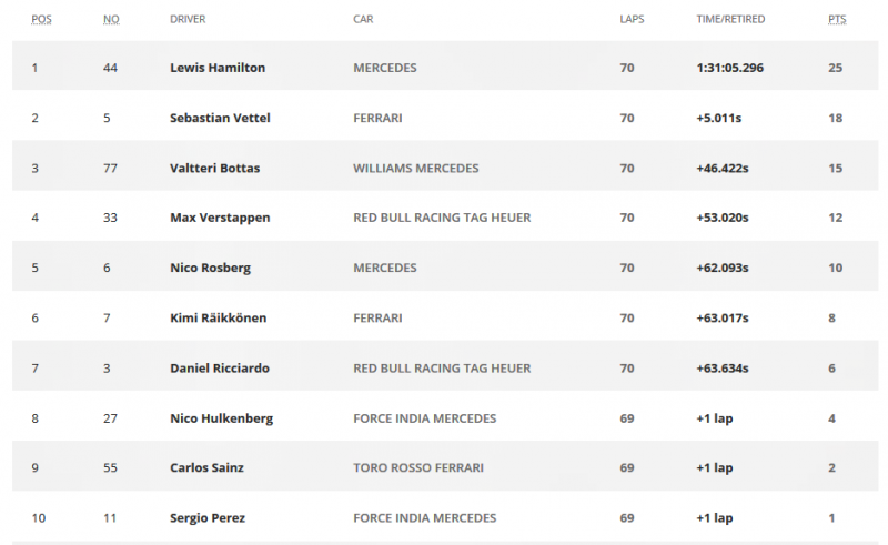 A második helyen a Ferrari négyszeres világbajnoka, Sebastian Vettel, a harmadikon pedig a Williams finn versenyzője, Valtteri Bottas végzett. A világbajnoki pontversenyben vezető német Nico Rosberg az ötödik lett. A harmadik helyről rajtoló Vettel már az első kanyar előtt az élre került, ráadásul az első pozícióból induló Hamilton összekoccant csapattársával, Rosberggel, ezért utóbbi jelentősen visszaesett. Vettel az első kör végén elvétett egy kanyart, ezért elvesztette az előnyét, de ekkor még az élen tudott maradni.