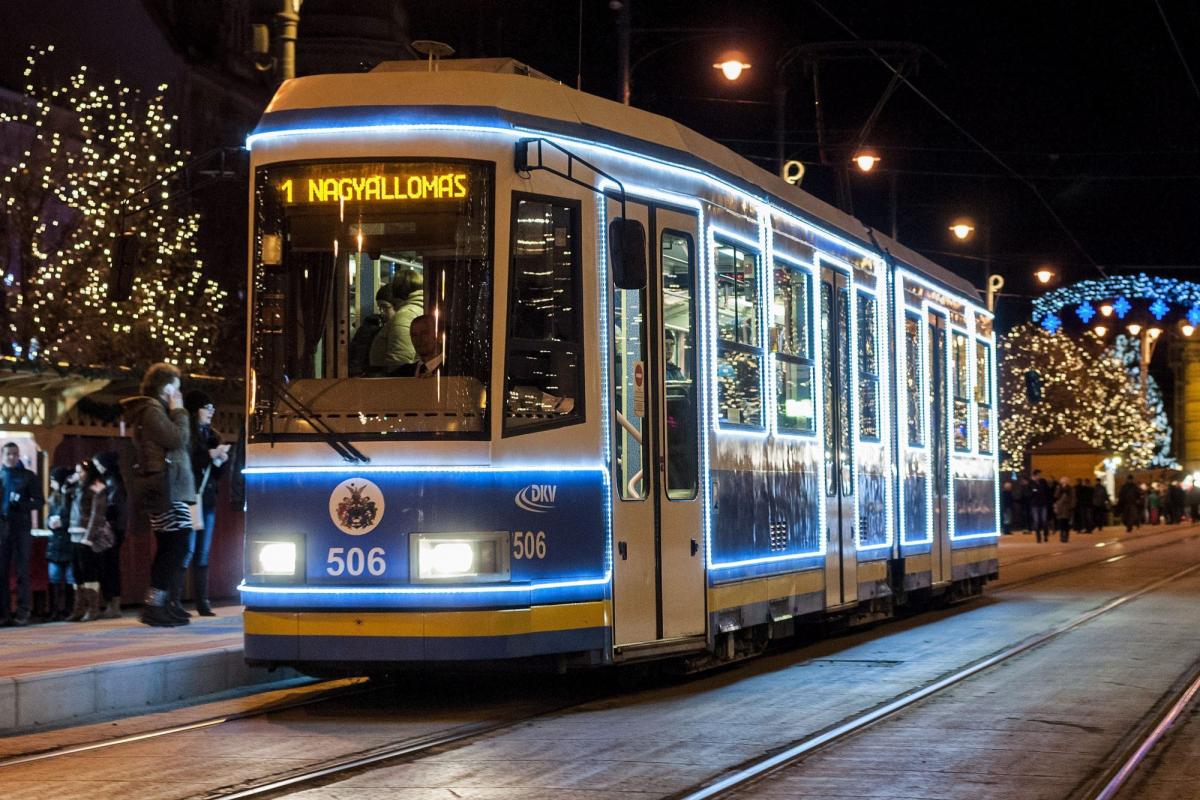 A DKV Debreceni Közlekedési Zrt. fényfüzérekkel feldíszített villamosa közlekedik a debreceni Kossuth téren. Az idén első alkalommal feldíszített 506-os számú villamos január 6-ig közlekedik minden nap a teljes vonalon.MTI Fotó: Czeglédi Zsolt