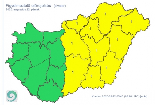 Erős zivatar alakulhat ki több vármegyében pénteken, elsődleges veszélyforrást a villámlás jelent, emellett esetenként szélerősödés, jégeső is előfordulhat! Az intenzív záporokból, zivatarokból rövid idő alatt 25-30 mm-t meghaladó csapadék hullhat.
