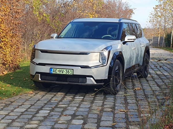Persze ezt a modellt hajtáslánctól függetlenül nem a száguldásra találták ki, az 1,75 méteres magassághoz, a 2,6 tonnás tömeghez és a kényelemre hangolt futóműhöz is a nyugodt vezetési stílus passzol, meg aztán egy ekkora batárnak az európai utak (főleg a városiak) hamar szűknek bizonyulhatnak. A kormányzás könnyű és pontos, de szinte teljesen élettelen, a fékpedál puha, de jól adagolható. Villanymotorokkal lehet a kormányoszlop helyzetét beállítani (de nem lehet eléggé kihúzni), a kényelmes vezetőülés magasan van, parancsnoki pozíciót biztosítva a vezetéshez. Nagyon odafigyeltek a csendességre, a zajt gondos szigetelés, laminált üvegek, hangelnyelő, szivaccsal tömött gumiabroncsok csökkentik minimálisra. Utazni elsőrangú autó az EV9, ha már van egy kis tempó, akkor az acélrugós futómű is szépen simítja ki az úthibákat. Városi tempónál főleg a 21 colos felnikkel szerelt GT Line azért hajlamost kicsit rázni, ha nem tükörsima az aszfalt.