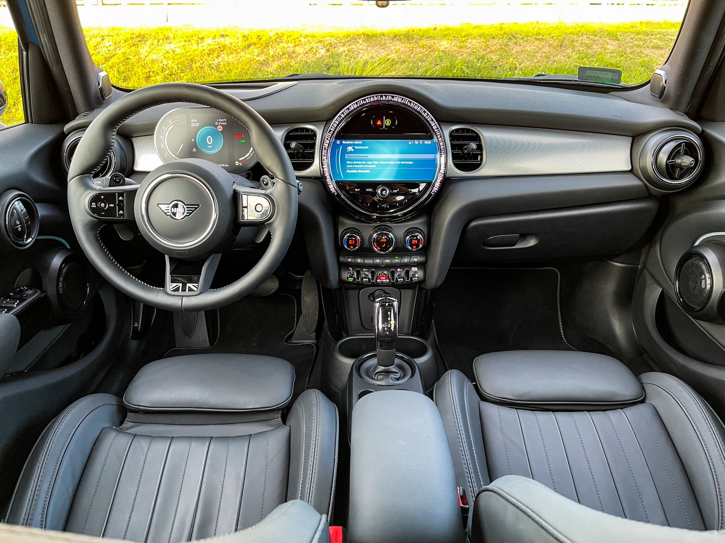 A belső térben is folytatódik a kerek idomok dömpingje. A középkonzolon a színes kijelző körül is a hagyományos kerek keret uralja a teret. A menü rendszer jól átlátható, a telefon vezeték nélkül kitükrözhető. Kezelhetjük érintéssel, vagy a váltókar mellett elhelyezett gombokkal és tekergetővel. A kormány kiváló fogású, közepén a króm karika közepén a hangsúlyos Mini logóval. Az új 2021-es szériában megváltoztak a kezelőgombok a kormányon. Letisztultabb (nekem mondjuk nem annyira tetszik, mint az előző) lett a felület, amely az azonos funkciókat rejti.