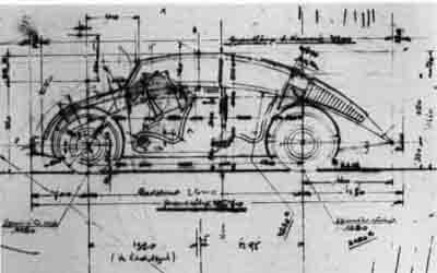 Vázlat 1929-ből. Barényi rajzolta meg az első Porsche sportautók vonalait is. A kocsikat már abban az időben biztonsági pedálokkal tervezte meg.