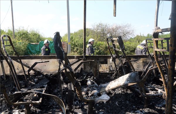 Tűzoltó dolgozik egy kiégett menetrend szerint közlekedő autóbusznál a Harsány és Miskolc közötti úton, Mályi térségében 2017. július 31-én. A tűzeset során senki nem sérült meg. MTI Fotó: Vajda János