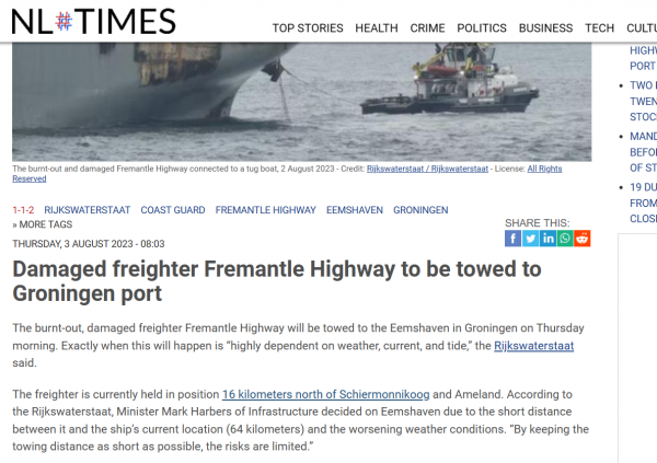 A mintegy kétszáz méter hosszú, japán tulajdonban lévő, de panamai zászló alatt közlekedő Fremantle Highway a Watt-tengeren, nyílt vízen gyulladt ki eddig ismeretlen okból múlt szerdán. Onnan kelet felé vontatták, Schiermonnikoog sziget közelébe.