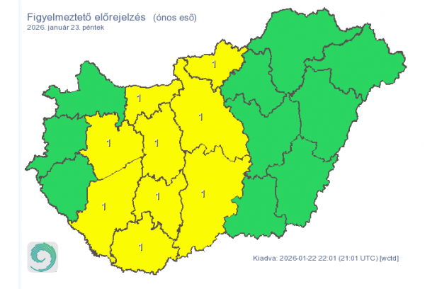 Péntek reggelig egy délnyugat-északkeleti sávban várható az országban gyenge, időszakos csapadék, ami északon havazás, dél felé haladva egyre inkább fagyott eső, ónos eső formájában jelentkezik. Az északon lehulló hó mennyisége lepel-1-2 cm között változhat, ónos esőből ~1 mm gyűlhet össze.