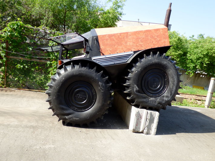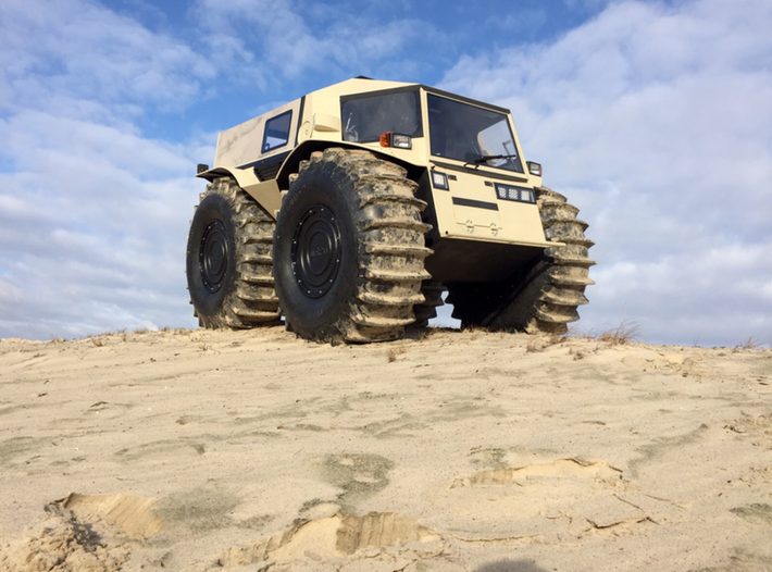 A hihetetlenül masszív kerekeinek átmérője 160 cm, melyekkel gyakorlatilag mindenen képes átgázolni. Az alváza a földtől mintegy 60 cm-re kezdődik, így a Sherp könnyedén átsiklik az olyan akadályok fölött, amikbe egy kisebb terepjárónak beletörne a bicskája.