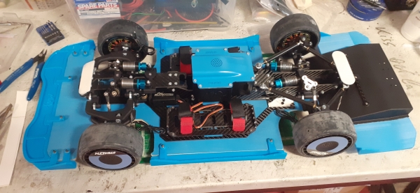 A modellautó futóműve egyébként nyomórudas felfüggesztésű, az olajos lengéscsillapító egybe van építve a rugóval. Az utóbbi előfeszítése állítható, a csillapításé nem. A kormányzást egy miniatűr elektromos szervómotor végzi.
