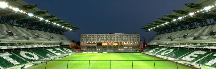 Korszerű stadion, háttérben a vadonatúj hotel. Már keresik a vevőt