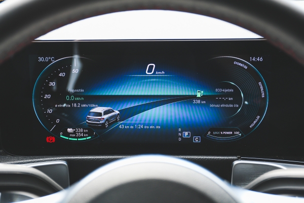 Ráadásul egy újabb olyan villanyos teszthetet tudhattam le, amikor egyszer sem kellett töltenem. Nálam a 350 4MATIC csúcsváltozat járt, aminek 420 kilométeres hatótávot ígérnek gyárilag, és ebből kb. 390 kilométert spórolás nélkül is tudott teljesíteni, hiszen csak néha kellett klímázni a teszthét során. Mindez szép teljesítmény, ha hozzávesszük, hogy egy 292 lóerős hajtásláncról van szó, ami tényleg képes térugrásra, zseniális villany-erőhang kíséretében. Gyári adat 6,2 másodperc alatt van százon, és még mindig egy hétüléses családi autóról beszélünk. Azt is értékeltem, hogy a gyárilag megadott 18,2 kWh-s fogyasztást nem kihívás elérni vele, sőt, nyugodt városi közlekedéssel, klíma nélkül, ez alá is be lehet kúszni, ami szinte példa nélküli egy olyan autónál, ami nem dedikált villanyos padlólemezre épül.