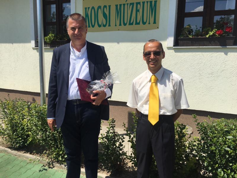 Knezsik István az Autós Nagykoalíció elnöke és Simon László polgármester Kocson, a kocsi múzeum előtt.