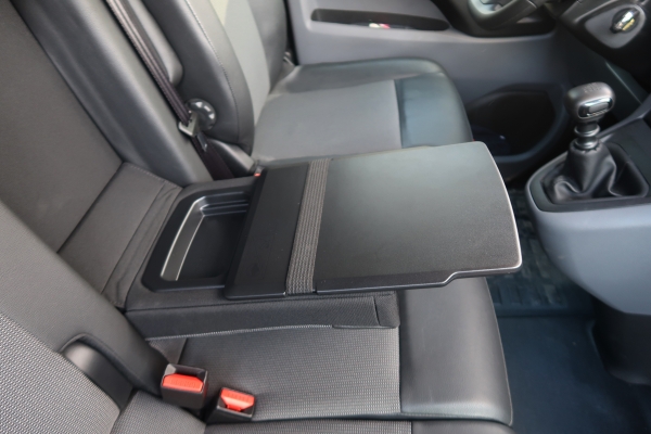 Megérkeztünk a rakodás helyére. Szűk helyen manőverezni nem könnyű egy ekkora hosszúságú, elég nagy fordulókörű zárt furgonnal, de nagyon megkönnyíti az első-hátsó „radar” és a tolatókamera színes, segédvonalakkal ellátott képe. A raktérhez jobb oldali tolóajtó és 180 fokig nyitható kétszárnyú hátfalajtó nyit utat – de van még egy titkos ajtó is: a jobb oldali ülés alatt. Ezt kinyitva és az ülést felhajtva az utas láblemezétől a hátsó lökhárítóig tart a hasznos tér, át lehet itt dugni lécet, létrát, sokféle hosszú rakományt, hogy ne kelljen tetőcsomagtartót használni. Emiatt persze nincs rakodóhely a szélső ülés alatt, de azért van egy kisebb középen, ahová az átrakónyílás igénybevételekor a kocsikísérő ülhet. Újabb jó pont: a fülke padlóján is vannak rakományrögzítő gyűrűk.
