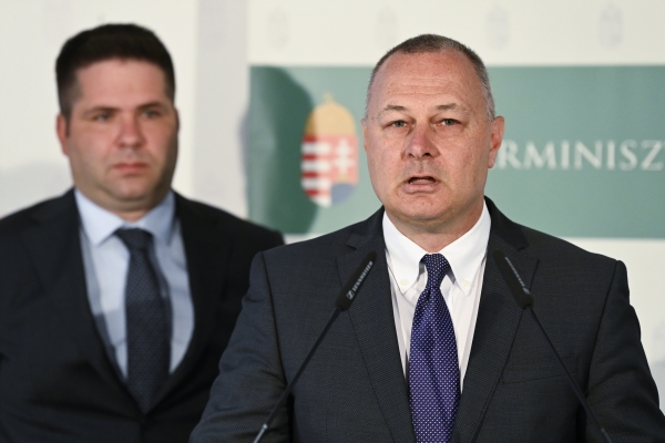 Egri Gábor, a Független Benzinkutak Szövetségének elnöke (j) és Nobilis Márton, az Agrárminisztérium élelmiszeriparért és kereskedelempolitikáért felelős államtitkára a kisbenzinkutak támogatásáról tartott sajtótájékoztatón az Agrárminisztériumban 2022. augusztus 16-án. Fotó: MTI/Kovács Tamás