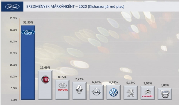 A Ford a kishaszonjármű szegmensben 7041 eladott kishaszongépjárművel alig 558 darabbal maradt el a tavalyi teljesítményétől, és lett piacvezető, amely a kishaszonjármű piac 32 százalékát jelenti, tehát elmondható, hogy tavaly közel minden harmadik újonnan forgalomba helyezett haszonjármű Ford volt. 2020-ban a Ford a pick-up szegmensben ismét domináns első helyett szerzett 2520 darabbal, közel 50 százalékos piaci részesedéssel. A szegmensben egyedülállóan széles, limitált Ranger Blue Edition és Ranger Thunder modellekkel kiegészített Ranger paletta ékköve a Ford Ranger Raptor Performance Pick-up, mely terepképességét ultra-erős alváz, egyedi futómű és gumiabroncs, 213 lóerős, 500 Nm forgatónyomatékú EcoBlue motor, 10 fokozatú automata sebességváltó, valamint Terepvezérlési Rendszer javítja.