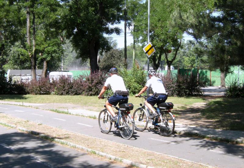 Kerékpáros rendőrök a városligeti KRESZ-parkban. Járőröznek és tanítanak.