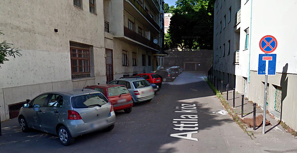 Bp. I. ker. Attila köz. Bal oldalon halszálkásan kialakított parkoló. Jobb oldal megállni tilos tábla.