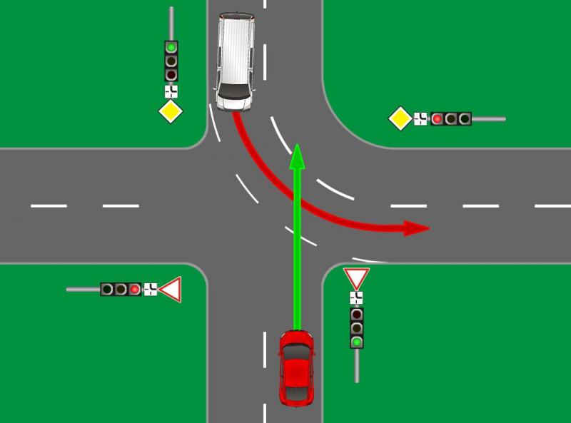 A mellékút felől érkezve viszont már találkozhatunk olyan helyzettel, amikor a szemből, a főútvonalról érkező, balra kanyarodóval a telezöld miatt elsőbbségi viszonyba kerülünk.