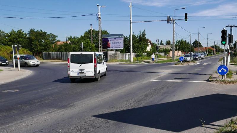 Budapesten, ezen belül Csepelen egyébként találtam egy hasonló útkereszteződést, azonban itt a kanyarodó főútvonal irányában már nyilas zöld lámpákat alkalmaznak: