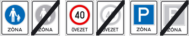 Hasonlóak az un. Zóna vagy Övezet jelzések, amelyek egy nagyobb területre érvényesek, és a kereszteződések itt sem változtatják meg a táblák alapértelmét.