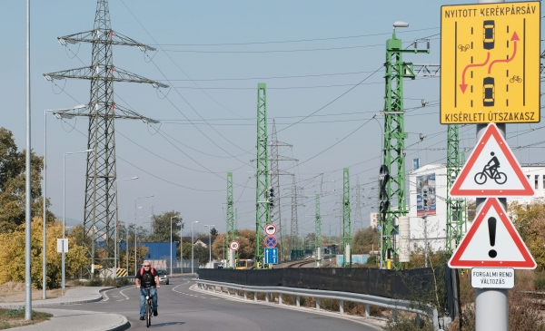 Máris feltűnik, hogy a jól megszokott sárga vonal helyett a nyitott kerékpársáv elválasztása szaggatott fehér jelzéssel történik.
