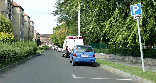 A képen egy merőlegesen kialakított várakozóhelyet láthatunk, a személygépkocsi az itt parkoló autók előtt tartózkodik.