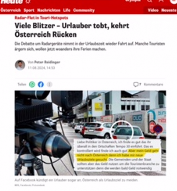 "A mobil sebességmérő kamerák száma folyamatosan növekszik Ausztriában. Ried im Innkreisben is több van. Braunauban (Felső-Ausztria) és Bad Ischlben (Salzburg), ahol a 30 km/h-s sebességkorlátozás az egész településen érvényes. A nyaralók ismételten a radarcsapdákba esnek” – írja a merkur.de online platform egy nagy jelentésében.