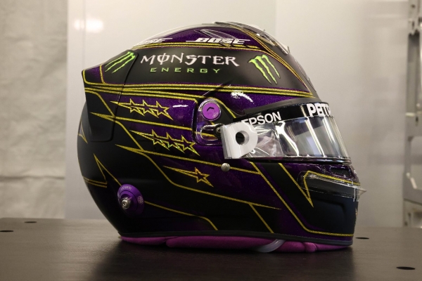 Hamilton sisakján a tavaly megszokott fekete-lila színvilág köszön vissza, valamint az arany is hangsúlyos lett (talán a 2020-as rekorddöntések, rekordbeállítások miatt). A fejfedőn a megszokott motívumok mellett a hét bajnoki címet – ezt a rekordot jelent Hamilton tartja Michael Schumacherrel közösen – szimbolizáló hét csillag is.