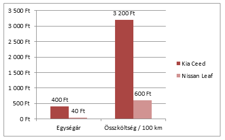 Míg egy Nissan Leaf fogyasztása 15 kwh / 100 km, addig a vele nagyságrendileg egy kategóriába eső, benzines Kia Ceedé 8 liter. A mai benzin- és villamos áram árakkal számolva szembetűnő a különbség az elektromos technológia gazdasági előnye, amelyet az alábbi diagram szemléltet: