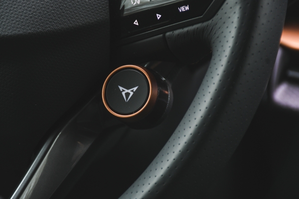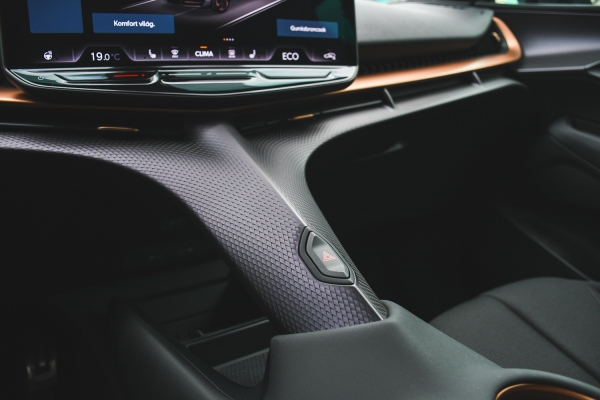 Mármint, erre a műszerfalra senki sem lehet felkészülve. Egy kígyósejt mintás, sötét lila boltív húzódik ellentmondást nem tűrően bele a középkonzolba, amiből két irányba hullámosan formázott, a Cupra réz színét megidéző idomok indulnak két irányba. Ezekből adódik az ajtók látványos megformázása is, illetve az újító kilincsek, amik a dekorlécből következnek. Egy gyönyörűen megkomponált kabin, ami érthetetlen, hogy hogy ment át a Volkswagen-csoport merev rostáján. Végre mertek merőben eltérni a megszokottól, még akkor is, ha így a középkonzol első rekesze és telefon tartója nem is feltétlenül esik annyira kézre. Ennyi nekem belefér a meghökkentő és dögös hatásért.