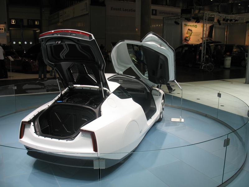 3. ábra: a mai rekorder forgalomba helyezhető személyautók körében a kétüléses VW XL1. Mint arról az Autószektor beszámolt, az első vevő át is vette a technika mai csodáját. Az XL1 fogyasztása gázolajból kevesebb, mit 1 liter 100 km-enként. Mint képünk mutatja a hibridjárműben még egy kis csomagtér is van.