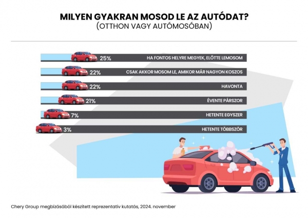 A névadáson, valamint az egyéniséget tükröző díszítéseken kívül az is sokat elárul arról, hogyan viszonyul egy sofőr az autójához, hogy mennyire tartja tisztán azt. Nos, ebben a vonatkozásban még van hova fejlődniük a hazai autósoknak, hiszen mindössze egyharmaduk mossa le otthon vagy autómosóban legalább havonta egyszer a gépkocsiját. A járműtulajdonosok kicsit több mint negyede csak akkor mossa le az autóját, ha számára fontos helyre, vagy emberekhez utazik vele, 22 százaléka pedig csak abban az esetben, ha már nagyon koszos. A válaszadók ötöde évente pár alkalommal mossa le autóját.