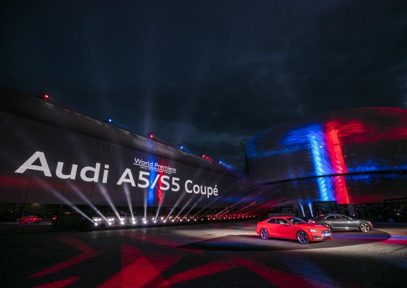 A sok-sok látványelem azonban ezen az estén az Audi A5 Coupét szolgálta, amely nagy taps kíséretében szinte besiklott a térre, követte az S5 Coupé is, s innentől már csak két autóra szegeződött a világ figyelme.