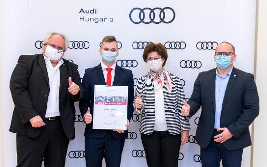 . Kiemelkedő szakmai kompetenciái elismeréseként díjat vehetett át Gyurenka Richárd, aki így az Audi Konszern hét legjobb szakmunkástanulója közé került. Richárd idén júniusban kiváló eredménnyel végezte el a karosszérialakatos szakmát az Audi Hungaria duális szakképzésében, és azóta a vállalat munkatársaként a járműgyárban kamatoztatja szaktudását. A fiatal pályakezdő az elmúlt évben a magyarországi „Szakma Sztár” megmérettetés aranyérmese lett.