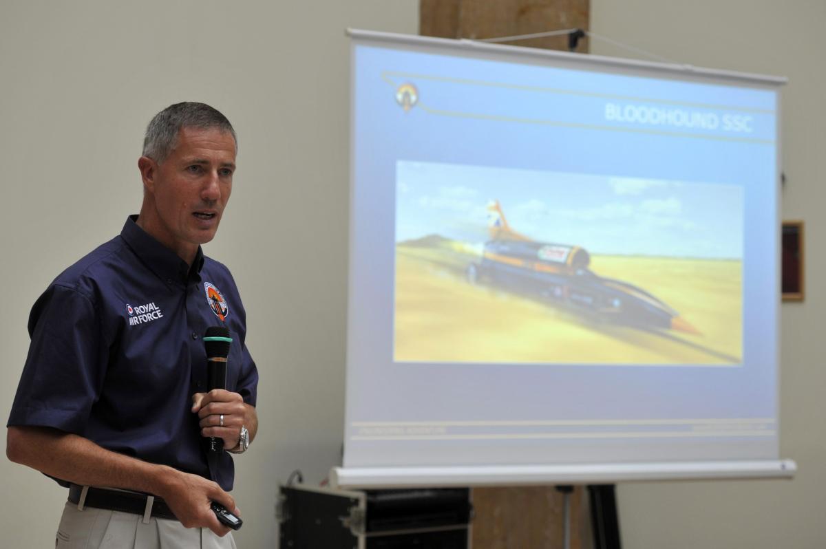 Andy Green, a brit királyi légierő vadászpilótája beszél a Bloodhound (veréb) szuperszonikus interaktív autómodell bemutatóján Nagy-Britannia budapesti nagykövetségén július 23-án. Az autóval 2016-ban sebességi világrekordot szeretnének felállítani. MTI Fotó: Kovács Attila