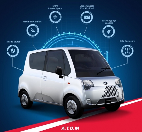 A Mahindra márka képviselői szerint az Atom sebessége elérheti az 50 km/órát egy 20 LE-s villanymotornak köszönhetően. Egy feltöltéssel 80-90 kilométert tud megtenni.