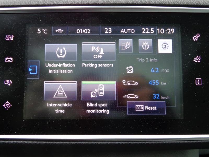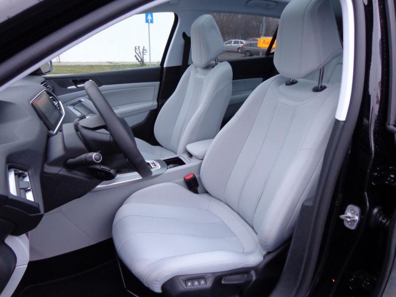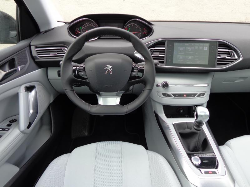 Aki azt hitte, hogy az újszerű műszerfal elrendezést – kis kormány, felette nézhető, a szélvédő tövébe tett apró műszerek – csak a 208-asba meri betenni a gyár, az nagyot tévedett, mert konzekvensen bevezették a 308-asban is. Azonban itt mintha ügyesebben lenne megtervezve a vezetői pozíció, én a magam 179 centiméterével képes voltam úgy elhelyezkedni a kényelmes, jó oldaltartású, masszázsfunkciós (!) vezetőülésben, hogy a kormány ne takarja ki a két, egyébként túl kicsi analóg órát. Pont a kitakarás miatt döntött úgy a Peugeot, hogy a fordulatszámmérő mutatója fordítva, jobbról balra kilengve működik, akárcsak az Aston Martinokban. Így a gyakrabban használt, alsó fordulatszám-tartomány az alacsony termetűek számára is mindig látható marad. Sajnos a kilátás egyik irányban sem túl jó, srégen az A-oszlopok, előrefelé a belső tükör vaskos konzolja, hátrafelé pedig a nagyon széles, de alacsony hátsó szélvédő és a széles C-oszlopok akadályozzák. Éppen ezért nagyon hasznos volt a parkolóradarokkal és navigációval együtt megvásárolható tolatókamera, amely segédvonalakat is kirajzol.
