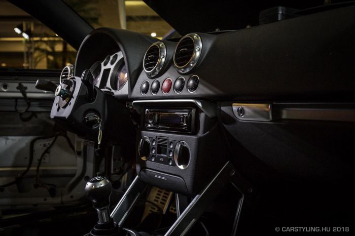 Bizonyára sokaknak fel sem fog tűnni, de a TT hátsó ajtaja sem az eredeti darab, hanem az izmosabbik verzió sajátja, rajta természetesen a gyári szárnnyal. Itt már a kábelezés is le lett tudva hozzá.