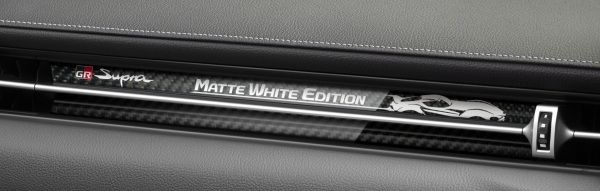 A Toyota GR Supra RZ Matte White Edition belsejében is több változás történt, ezek közül a legszembetűnőbb az új, cserszínű kárpit, amely valódi bőrből készült, és az üléseken kívül a középső térdtámaszon és könyöklőn, valamint az ajtóbetéteken is megjelenik. Még a háromküllős, multifunkciós kormánykereket is részben ez a világosbarna bőr borítja, a küllők pedig zongoralakk betéteket kaptak. Aki elfelejtené, miben ül, a limitált széria hivatalos nevét az első utas előtti légbeömlő szénszálas díszbetétjéről olvashatja le, de karbon dekorációt alkalmaztak a középkonzolon, a vezeték nélküli telefontöltőnél is, amely kapott egy plusz USB csatlakozót 2,1 amperes áramerősséggel.