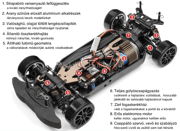 Az MM-22-es kefés, 540-es elektromos motort az MSC-30BR-WP elektronikus fordulatszám-szabályzó, vagyis ESC vezérli. A kormányzásért az MS-22-es kormányszervó felel.