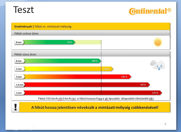 „A gumiabroncsok nem megfelelő állapota miatt bekövetkező közlekedési balesetekről nem áll rendelkezésre részletes statisztika, azonban becsléseink szerint egy évben több száz közlekedési baleset kialakulásáért a kopott, nem megfelelő légnyomású, illetve nem az évszakhoz illő gumiabroncsok tehetők felelőssé” – hívta fel a figyelmet Menkó Illés, a Continental Hungaria Kft. műszaki szakértője. Hozzátette: Magyarországon évente átlagosan legalább 25-30 esetben a defekt nevezhető meg balesetet okozó tényezőként. A biztonságos közlekedéshez elengedhetetlen a járművek felszerelése az évszaknak megfelelő gumiabroncsokkal. A nyári abroncs összetételéből adódóan jobb tapadást biztosít nyári körülmények között, mint a lágyabb keverékkel készülő téli gumi, amelyet elsősorban a csúszós, havas utakra terveztek.