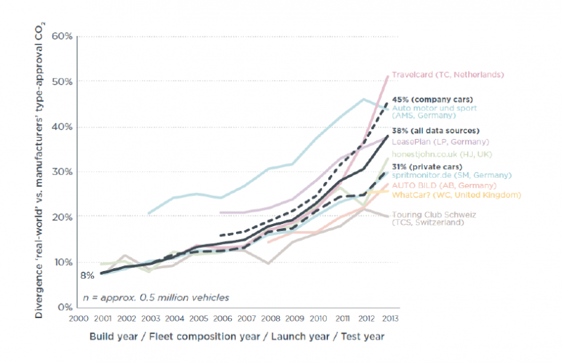 Mindemellett a járművek fogyasztása és ezzel együtt a CO2 kibocsátási értéke csak papíron és a reklámokban csökken. A valóság egyre gyorsuló eltérést mutat a gyártó és a tények között, ami nem csak az autógyárak szavahihetőségének devalválódásához, a vásárlóknak tetemes pénzébe (tavaly 450 €/év), a földnek pedig változatlanul gyorsuló légköri felmelegedésbe kerül.