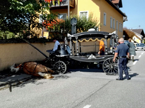 A fura baleset nem a világ végén történt, hanem a szomszédos Ausztriában, Mondsee településen, ahol régi tradíciók szerint a halottas kocsit lovak vontatják a 21. században is. A koporsó nem volt rajta a kocsin, amikor a lovak megbokrosodtak és Mondsee főutcáján hatalmas vágtába kezdtek. Két embert kis híján elsodortak, az egyik egy tolókocsiban levő mozgássérült asszony volt, azonban az utolsó pillanatban le tudtak húzódni a vágtató lovak elől.