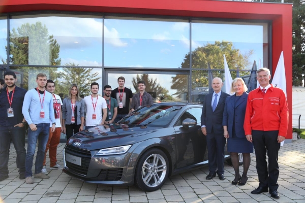 Piëch - jobbról a harmadik - bécsi egyetemistákkal Győrben. Mellette felesége Ursula és Thomas Faustmann, az Audi Hungaria ügyvezetésének akkori elnöke.