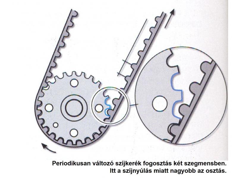 Amikor a PD elem létrehozza a nyomást, melyhez nagy hajtó forgatónyomatéka kell, a szíjerő is nagy lesz. A szíj kicsit megnyúlik. Ezzel a fogosztás is nagyobb lesz. Ha a kerékbe kialakított fogárkok ebben a kerékszegmensben nem alkalmazkodnak ehhez, akkor a szíj nem fog pontosan beleülni, a szíj hamar elhasználódik. Ezért van az, hogy a szíjkerék fogosztása mentén nem azonos! Apró, de nagyon fontos konstrukciós finomság.