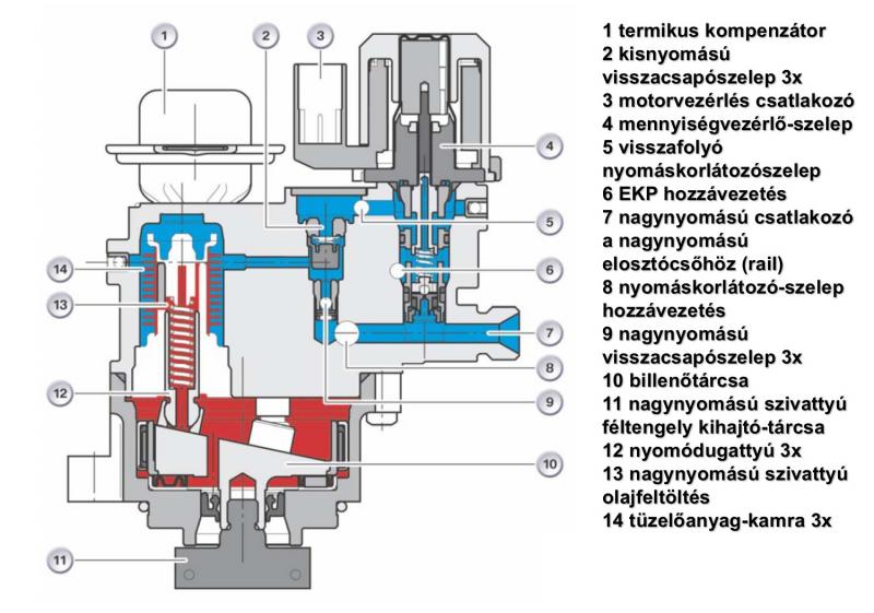 A harmonika membránt belülről hidraulikaolaj tölti fel, ha ennek nyomását megnöveljük, akkor a harmonika kitágul, ha csökkentjük a nyomász, összehúzódik. A harmonika körül, zárt térben van a motorbenzin. Ha a harmonika összehúzódik, a zárt térbe a szívószelepen keresztül beáramlik a benzin, ha a harmonika kitágul, térfogat kiszorítással a nyomószelepen keresztül továbbítja a benzint. A harmonikákban a folyadéknyomást dugattyú növeli, a dugattyúkat, mert több van belőlük az egyenletes szállítás érdekében, támolygótárcsás hajtás (mint egyes légkondicionáló kompresszorában) emeli, illetve süllyeszti. Képeinken a működést világossá teszik.
