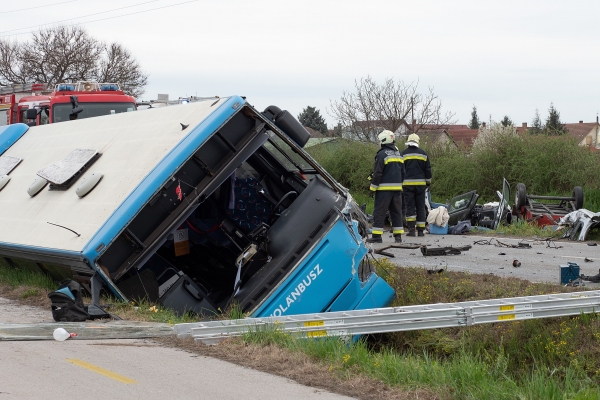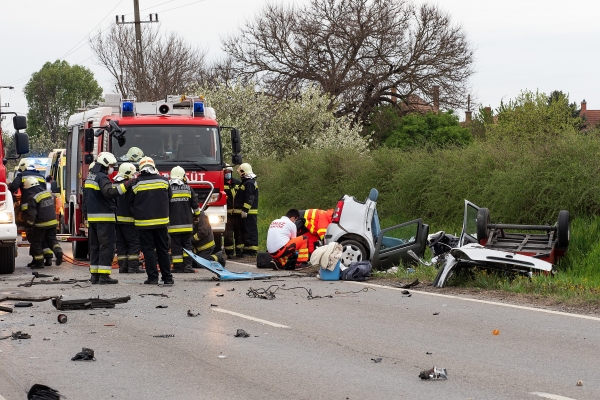 Tűzoltók és mentők az 54-es úton, Soltvadkertnél, miután összeütközött egy autóbusz és egy személygépkocsi április 28-án. A balesetben a személyautó vezetője meghalt. Fotók: Donka Ferenc - MTI. Első híradásunkat itt olvashatja.