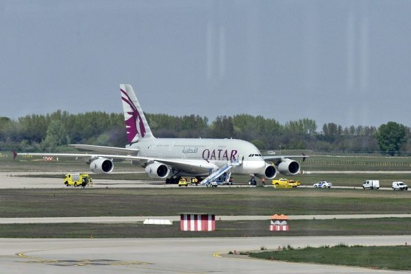 A Qatar Airways Dohából Londonba tartó járata a Liszt Ferenc-repülőtéren 2019. április 19-én. A gép egy utas rosszulléte miatt szállt le. A világ legnagyobb befogadóképességű utasszállító repülőgépe, a kétszintes, négyhajtóműves Airbus A380-800-as eddig csak egyszer, egy 2011-es bemutatón landolt Budapesten, mert a ferihegyi repülőtér csak korlátozásokkal képes kiszolgálni ezt a géptípust. MTI/Mihádák Zoltán