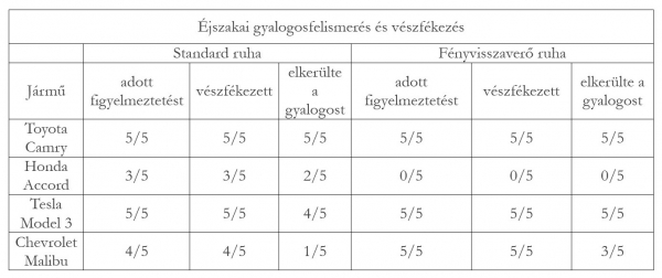 Az AAA azonban csavart még egyet a feltételeken és azt is feltárta, hogy számít-e a gyalogos ruházata. Ezért a tesztek során a kutatók fényvisszaverő mellényt is adtak a robotokra, ám az eredmények vegyesek lettek. Egyes autók, például a Honda, még rosszabbul teljesítettek; mintha a fényes ruha összezavarta volna az érzékelőket. Mondanunk sem kell, hogy a Toyota ezt a tesztet is hibátlanul oldotta meg - azt gyanítjuk, hogy a Camrynek az óvodában távcső volt a jele.
