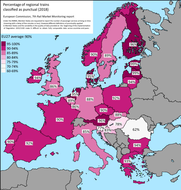 A regionális vonatok pontossági adatat nézve már sokkal rosszabb a hazai mutató: a vonatok 78 százaléka ér időben a célállomásra, amivel csak Szlovéniát (77 százalék) és Romániát (62 százalék) előzzük meg.