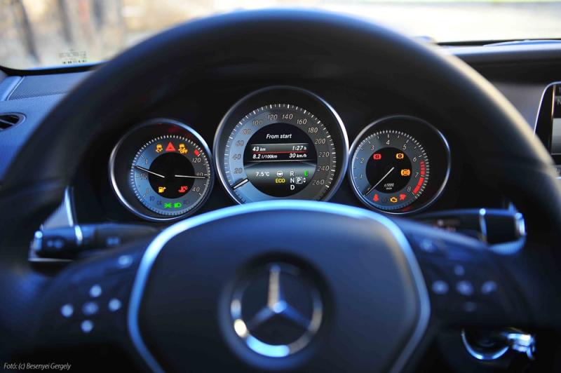 A gyújtáskulcs elfordításáig szinte alig észrevehető változásokat detektálhatunk a beltérben. A műszerfalon megjelenő információk grafikai megjelenése némiképp változott, e mellett a közép konzol tetején található légbeömlők közé egy stílusos analóg órát helyeztek. Megmaradt azonban a pedálos rögzítő fék, az ablaktörlő-kapcsoló helyén található automataváltó fokozatválasztó karja, a körbefutó hangulatvilágítás és – az érintőképernyő helyett továbbra is forgókapcsolóval kezelt – infotainment egység. Természetesen az összeszerelés minősége és a kezelőszervek működése továbbra is kifogástalan és a helykínálatra sem lehet panasz, de a lényeg még csak ezután jön. Az E-osztályban fellelhető vezetéstámogató rendszerek számát és precizitását jelenleg egyetlen kategóriatárs sem múlja felül. A táblafelismerő rendszer már nemcsak a sebességkorlátozást ismeri fel, hanem az egyéb tiltó és feloldó jelzéseket is. Az aktív sávtartó automatika és a holttér figyelő asszisztens együttes működése is parádés. A háromdimenziós képet alkotó sztereo kamera képének köszönhetően a rendszer képes a sávban tartani az autót akkor is, ha nem jelzi folytonos vonal a haladási sávot, vagy az útburkolati jelek szennyeződés miatt vagy egyéb okból nem látszanak. Ha mégis bekövetkezne a szándékolatlan sávelhagyás, az ESP beavatkozik és az ellenkező oldal fékezésével visszatéríti a járművet a biztonságos nyomvonalra (0-200 km/h között).