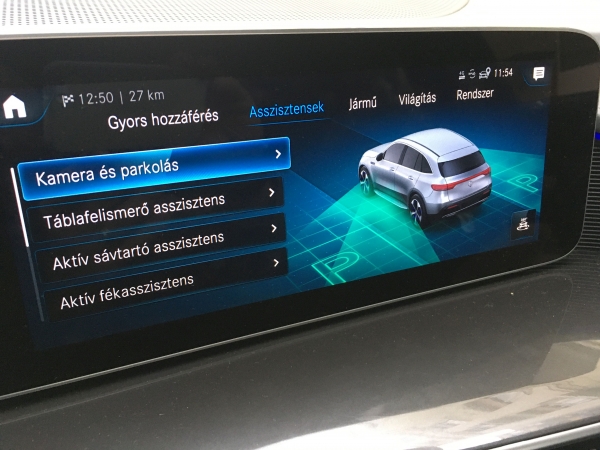 A villanyautós kompromisszumok mellett az EQC egyből nem enged: igazi Mercedes. Minden ott van, és úgy működik, ahogy egy Mercedeshez illik: kormányváltó, rögzítőfék, kapcsolók, kijelzők, érintésvezérelt kormánygombok, 13 hangszórós Burmester hifi, aktv és kezdeményező vezetősegédek. Az ergonómia példás, az ülés finoman masszíroz, a hangszórók alumíniumszerű rácsos borítása pedig egyedi hangulatot áraszt. A vezérlőfelület maga egy programnyelv, amit vagy elsajátít az ember, vagy kiszáll a Mercedes-világból. Nem bonyolult, de megszokást és tanulást igényel az mbux-nak nevezett rendszer. A tapipad kissé érzékeny, a gesztusvezérlést pedig jobb nem erőltetni, tévútnak tűnik.